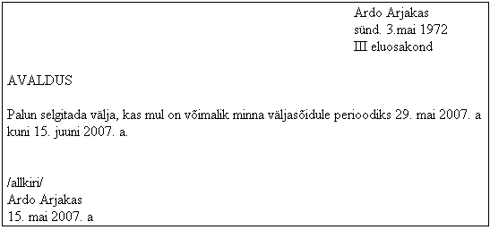 Pöördumise eesmärgiks on see, et kinnipeetav Ardo Arjakas saab soovitud ajal minna lühiajalisele väljasõidule. Pöördumise sisuks on taotlus saada luba lühiajaliseks väljasõiduks ehk vangla direktori vastavaisuline haldusakt. Tegemist on taotlusega HMS § 14 tähenduses, sest kinnipeetav soovib kasutada taotluse esitamisega temal VangS § 32 sätestatud subjektiivset õigust lühiajaliseks väljasõiduks (laiemas mõttes PS § 20 vabadust ja § 36 liikumisvabadust). Sellist taotlust tuleb menetleda vastavalt HMS-le, arvestades VangS § 11 sätestatud erisusi. Justiitsministri 30.11.2000 määruse nr 72 "Vangla sisekorraeeskiri" §-des 78-89 kohaselt peab kinnipeetav esitama kirjaliku taotluse ja koostama väljasõiduplaani. Taotluse rekvisiidid ja lisad on määratud VSKE §-s 81 ning enne taotluse menetlusse võtmist peab kontaktisik kontrollima, kas taotlus vastab vorminõuetele. Võrreldes kaasuses oleva taotlusega on puudu väljasõidu põhjus, väljasõidu täpne aadress, isikute nimed, kelle juurde tahetakse minna, ning kinnipeetava kinnitus selle kohta, et talle on tutvustatud väljasõidu tingimusi ning et teda on hoiatatud tagasipöördumistähtaja rikkumise ja muu õigusrikkumise toimepanemise tagajärgede eest. Lisaks tuleneb vangla sisekorraeeskirja §-st 79, et taotlus peab sisaldama väljasõiduplaani ning ka see on kaasuses olevas taotluses puudu. Kuna vangla sisekorraeeskirja § 79 lg 2 kohaselt koostab kinnipeetav väljasõiduplaani sotsiaaltöötaja abiga, siis peaks kontaktisik suunama kinnipeetav Ardo Arjakas'e sotsiaaltöötaja juurde väljasõiduplaani koostamiseks. Alles siis, kui need tingimused on täidetud, saab hakata kinnipeetava taotlust sisuliselt läbi vaatama.