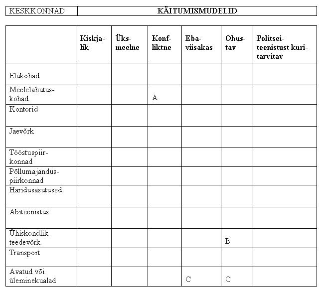 - probleemiga võib seotud olla mitu käitumismudelit või keskkonda. Nt kodutud võtsid kasutusele ehitusplatsiga piirnevad mahajäetud hooned. Need olid avatud või üleminekukeskkonnad. Kodutute tegevusega kaasneb ebaviisakus (C), kuid nende hoonete hõivamise taktika ohustas neid endid. Seega on ohustatus teine sobiv käitumismudel (C)