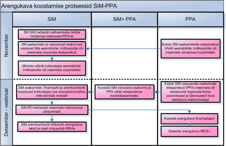 Joonis. VAAK-i koostamise protsess ning SiM ja PPA koostöö. Allikas: Arengukava planeerimise protsess. Siseministeeriumi kommentaar on, et arvestades, et arengu- ja tegevuskavade ning riigieelarve infosüsteemi põhjal riigieelarve planeerimise protsess on üle riigi alles kujunemisjärgus, võib eeltoodud protseduurides toimuda vastavalt rahandusministeeriumi suunistele muudatusi, mis aga oma olemuselt ei välju riigieelarve seaduse ja Vabariigi Valitsuse l3.detsembri 2005 määruse nr 302 raamidest.